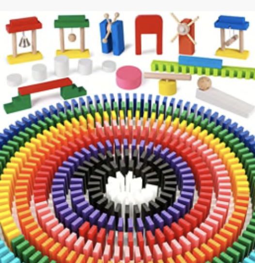 Lewo 1000-Piece Dominoes Set. Dominoes, though they take a while to set up, are fun to knock down. Little ones can get a kick out of watching the bright colors collide and can even create obstacles for the 1,000 pieces using the included ramp and bell.